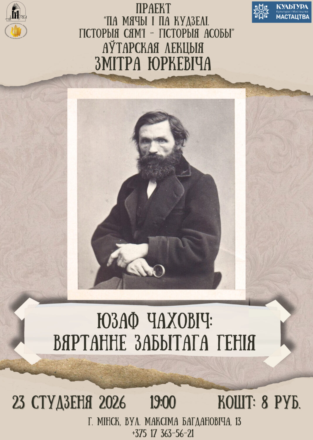 З гісторыяй творчых шляхоў Юзафа Чаховіча, гісторыяй яго сям’і і  сувязямі з Віцебшчынай запрашаем пазнаёміцца на лекцыі даследчыка Змітра Юркевіча ў межах праекта “Па мячы і па кудзелі.  Гісторыя сям’і – гісторыя асобы”.